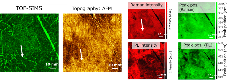 图5. WS2样品在不同显微设备上的跨平台分析,1 µm左右的晶界清晰可见