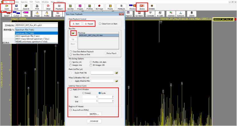1.左键点击【Playback】按钮,在页面的【Raw File】中选择原始【*.raw】文件,点击【Start】完成数据回溯。此外,可通过Playback页面的【Limit by Time or Cycle】和【Regions of Interest】,选择设置回溯的起始/终止时间、层数及感兴趣区域等。