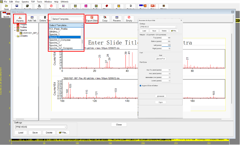 1.点击功能栏【Slides】,进入【Slides】界面后可导出已打开的谱图数据。该界面左上角【Params】为谱图尺寸、字体等参数的设置按钮,中间【Select Template】为选择模板,右侧为spectrum预览区域(header、坐标范围、放大倍数、标签等均可进行自定义)。最后单击【Export Slide】按钮将编辑好的谱图导出到PPT,完成图表和曲线的绘制。