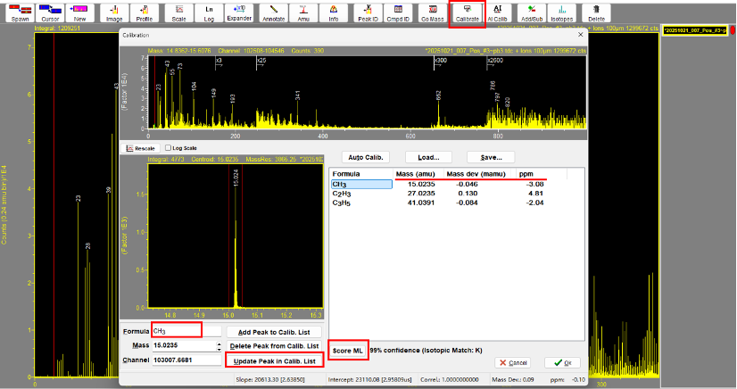 3.使⽤双光标将列表中的每个峰选中,点【Update Peak in Calib】更新校准。