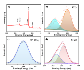 图1.原始KSC电极材料的XPS谱图:(a)全谱;(b)K 2p;(c)Sn 3d5和(d)Cl 2p。
