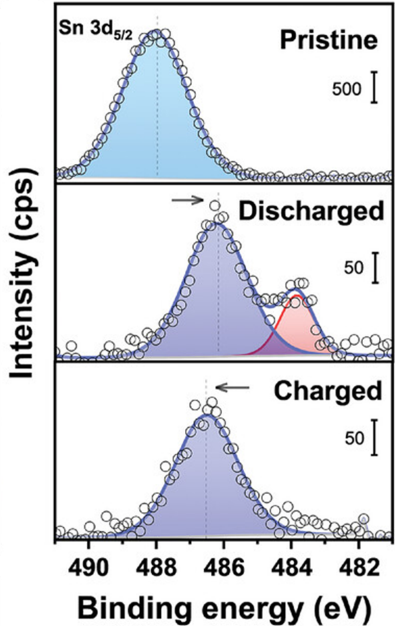 图2. KSC电极在原始、放电和充电后的XPS精细谱:Sn 3d5