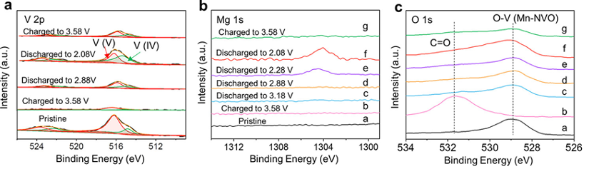 图1.不同充放电状态下Mn-NVO电极的(a)V 2p、(b)Mg 1s和(c)O 1s的XPS谱图。