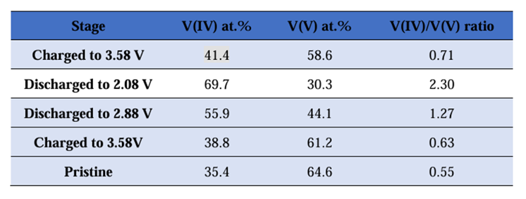 表1. 通过XPS获取的Mn-NVO电极在不同充放电状态下V(IV)和V(V)物种的相对含量及比例