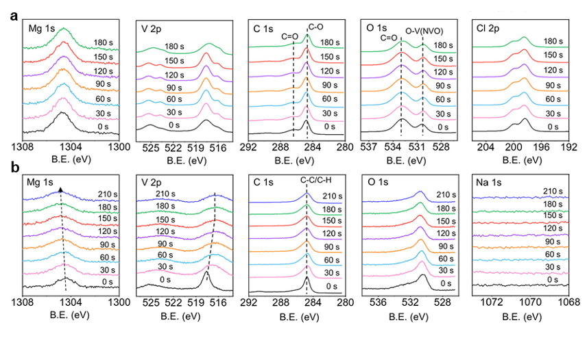 图2. Mn-NVO电极在(a)第一次完全充电和(b)第一次完全放电状态下不同Ar+溅射时间的XPS谱图