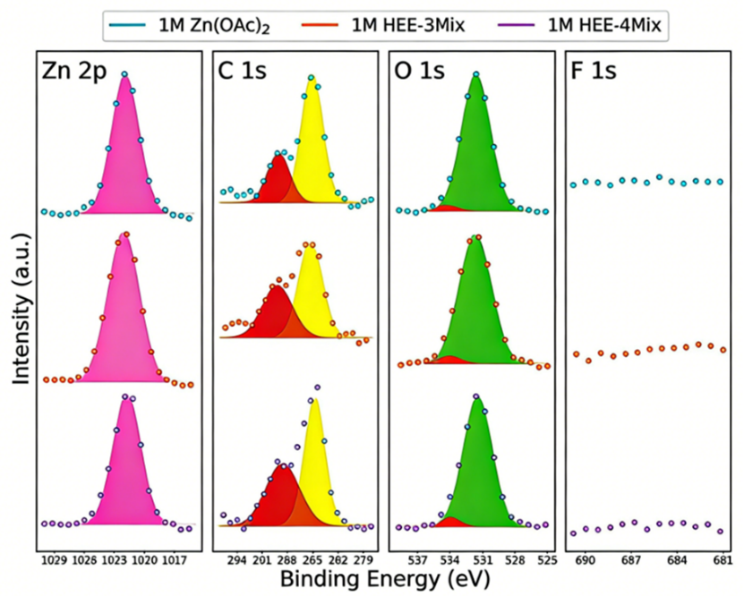 当然,电池性能的改善不仅源于锌电极沉积物理形貌的优化,更关键的是对其表面化学状态的调控。为解析不同电解液体系中锌沉积的表面化学状态,利用XPS分别采集了三个体系的Zn 2p、C 1s、O 1s及F 1s精细谱(见图2)。结果显示,尽管高熵电解液体系(如HEE-4Mix)富含四氟硼酸根和三氟甲磺酸根等含氟阴离子,但SEI膜主要组分却是源于第一溶剂化壳层分解产生的碳酸锌,而第二壳层中的阴离子(如含F、S的阴离子)并未大量进入SEI。XPS进一步证明高熵电解液中的阴离子与锌离子配位能力较弱,无法有效进入第一溶剂化壳层,因而未直接参与SEI膜的形成。上述结论与分子动力学模拟结果高度吻合,深刻阐明了高熵电解液的设计原理:其并非通过改变SEI膜的化学组成发挥作用,而是通过优化第二溶剂化壳层的构型熵,实现对界面反应动力学的精准调控。