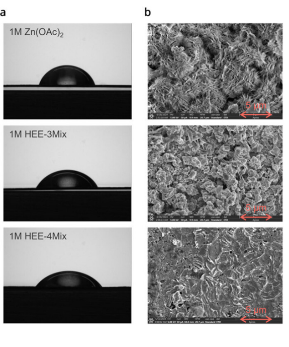 图1. Zn负极的界面表征:(a)三种电解液的接触角测量;(b)在2 mA/cm2 1 mAh条件下Cu上沉积Zn的SEM形貌。